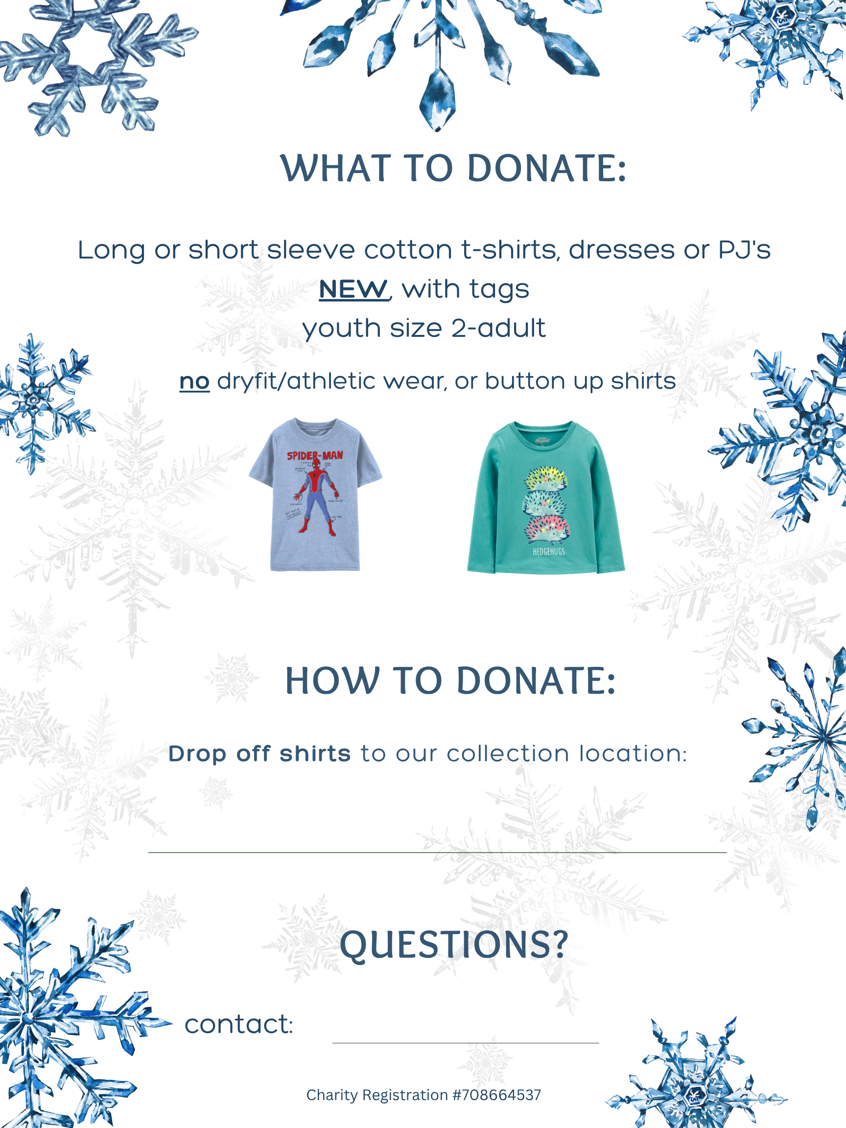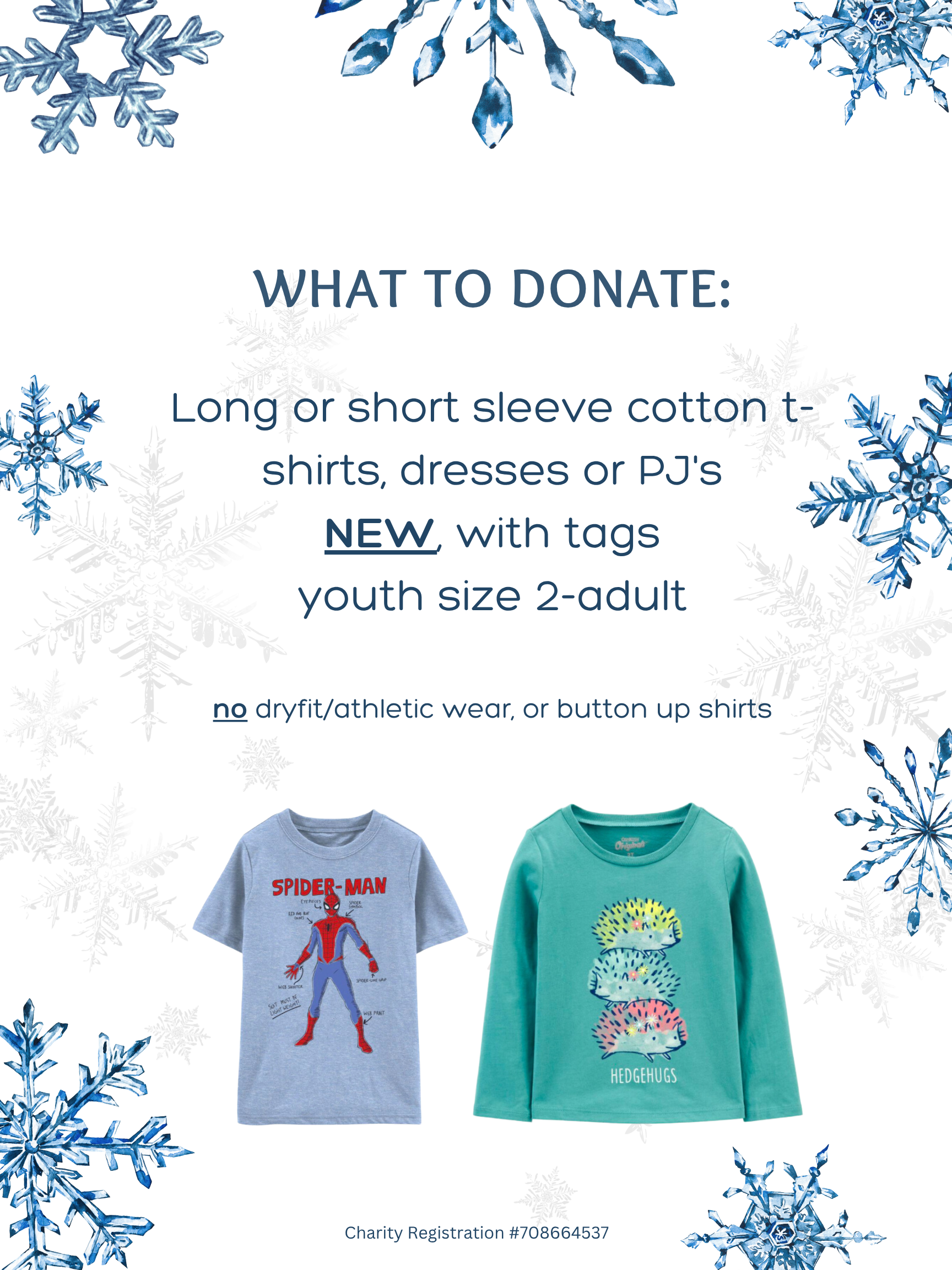 We are collecting new shirts (youth size 2-adult), which will